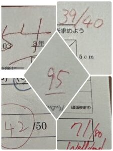 英語95点、数学93点(54/60+39/40)、英単語84点(43/50)、理科89点(71/80)